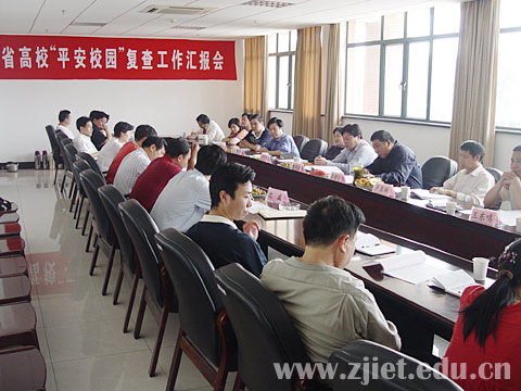 5月10日下午,以省综治办协调室主任张卫星为组长、下沙高教园区管委会办公室主任薛晓飞为副组长的浙江省高校“平安校园”复查组来我院检查指导“平安校园”整改落实情况。学院党政领导童学敏、李曙明、潘素芳、卢显林、潘新华、王建华,各系总支书记、行政处室负责人,紫元公司物管部经理王东鸣参加了汇报会。