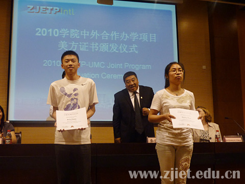 Gillette博士代表美国明尼苏达大学的校董事会对首届合作办学毕业生表示祝贺。她说,该批毕业生的顺利毕业,倾注了两校间各级领导和多位教师的心血,我们期待两校之间的合作能够继往开来。她同时也对8月份将要赴美国明尼苏达大学克鲁斯丁校区进行本科阶段学习的19名同学表示欢迎。