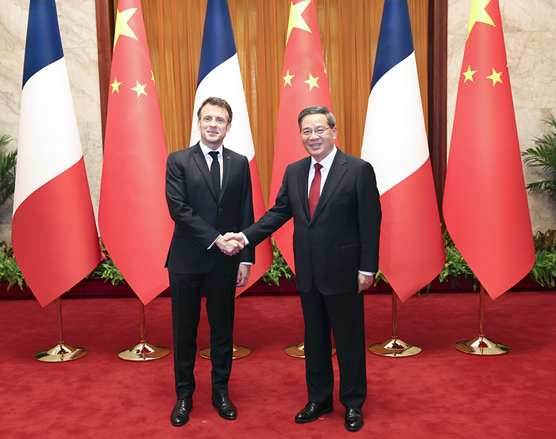 4月6日,国务院总理李强在北京人民大会堂会见来华进行国事访问的法国总统马克龙。新华社记者 庞兴雷 摄