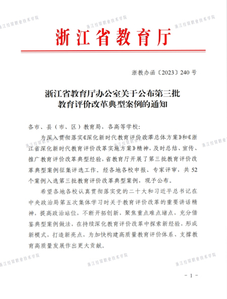 近日,浙江省第三批教育评价改革典型案例评选结果公布,我校报送的案例“合作协同、诊改引领、数智赋能、多维驱动高职教育评价改革”成功入选,这是学校在入选首批浙江省教育评价改革典型案例、开展教育评价改革试点校建设以来,在教育评价建设方面取得的又一成果。本次评选旨在深入贯彻落实《深化新时代教育评价改革总体方案》和《浙江省深化新时代教育评价改革实施方案》精神,及时总结、宣传、推广教育评价改革典型经验,经各地各校申报、专家评审,共有52个案例入选,其中高职10个。